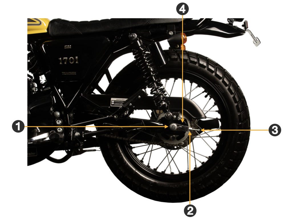 - คลายนัตยึดเพลาล้อหลัง ① และคลายนัตล็อค ② ให้หลวม จากนั้นขันสกรูปรับตั้ง ③ โดยให้โซ่มีระยะหย่อนตัวประมาณ 20 – 30 มม. (ขันสกรูปรับตั้งทั้ง 2 ข้าง)